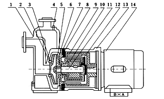 | 8.隔離層 | 9.外磁鋼總成 | 10.內磁鋼總成 | 11.泵軸 | 12.軸套 | 13.聯接架 | 14.電機 |